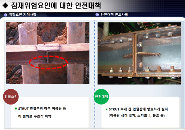 버팀대(STRUT) 및 띠장(WALE BEAM) 연결부위 안전대책 : 4쪽으로 구성되어 있습니다.