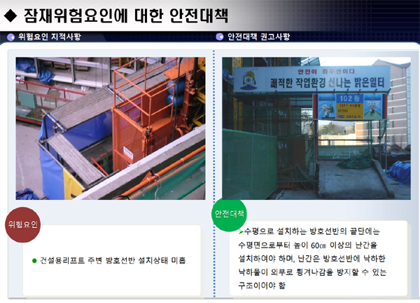OPL : 건설용리프트 주변 방호선반 설치상태 미흡